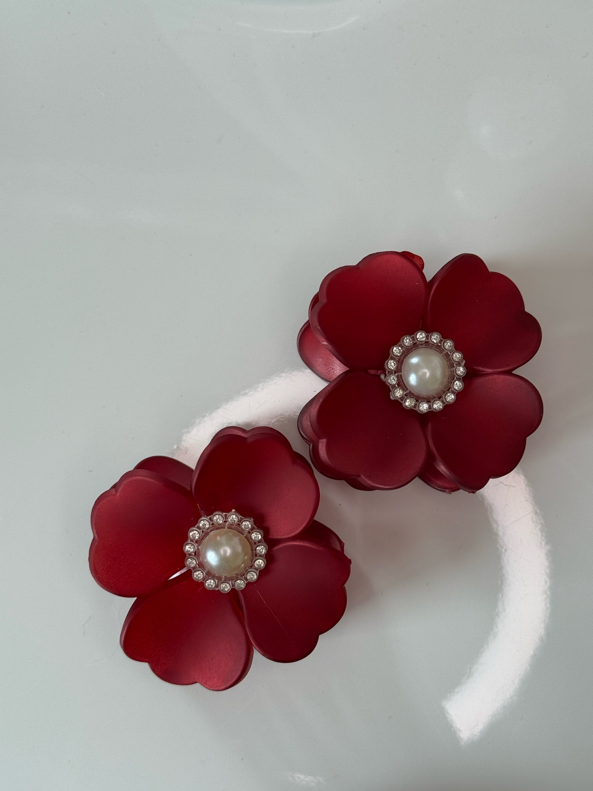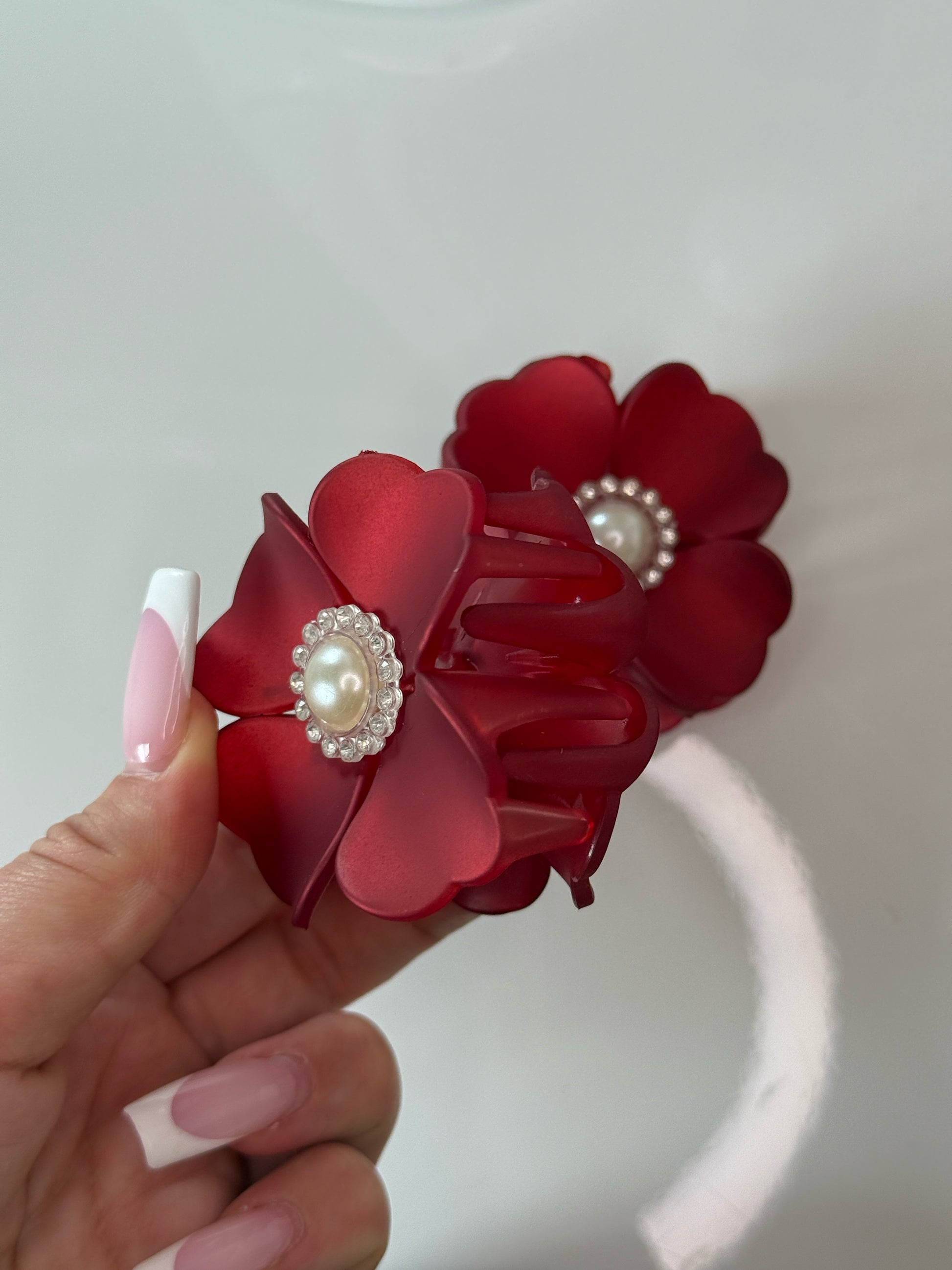Elegantní červený květinový skřipec zdobený perlou uprostřed přidá tvému účesu šarm a jemný luxus. Sytá červená barva v kombinaci s perlovým detailem vytváří dokonalý doplněk jak pro běžné nošení, tak slavnostní příležitosti.