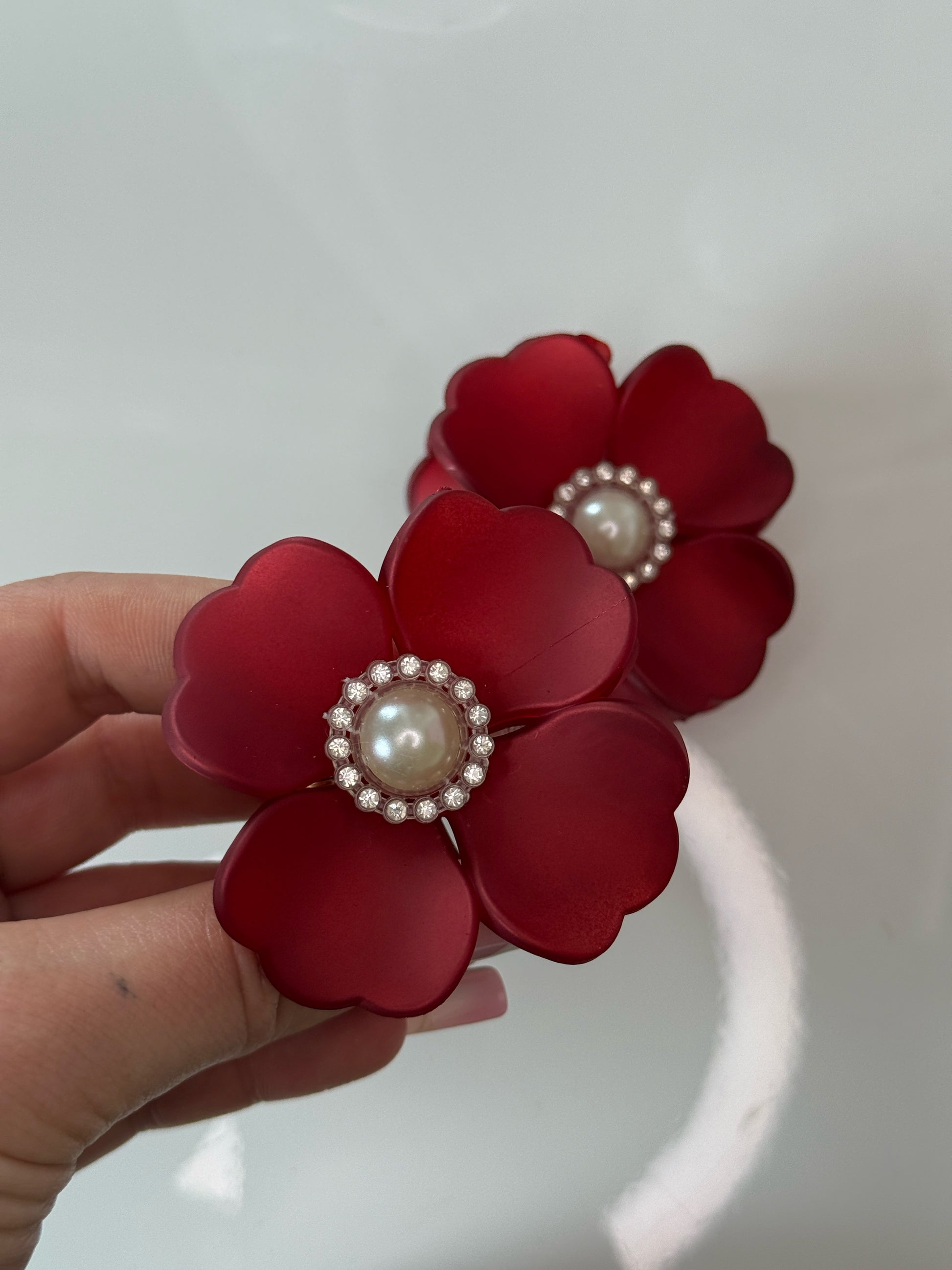 ❤️ Červený květinový skřipec s perlou uprostřed