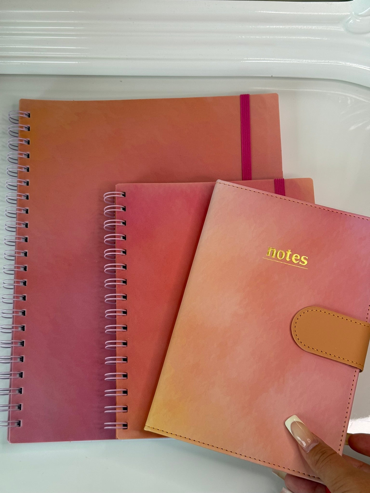 Tři různé velikosti (A4, A5 a zápisník s klopou) s jemným pastelovým přechodem v tónech růžové, oranžové a meruňkové barvy jsou nejen praktické, ale i nádherně sladěné. Perfektní volba pro školu, plánování nebo kreativní psaní.