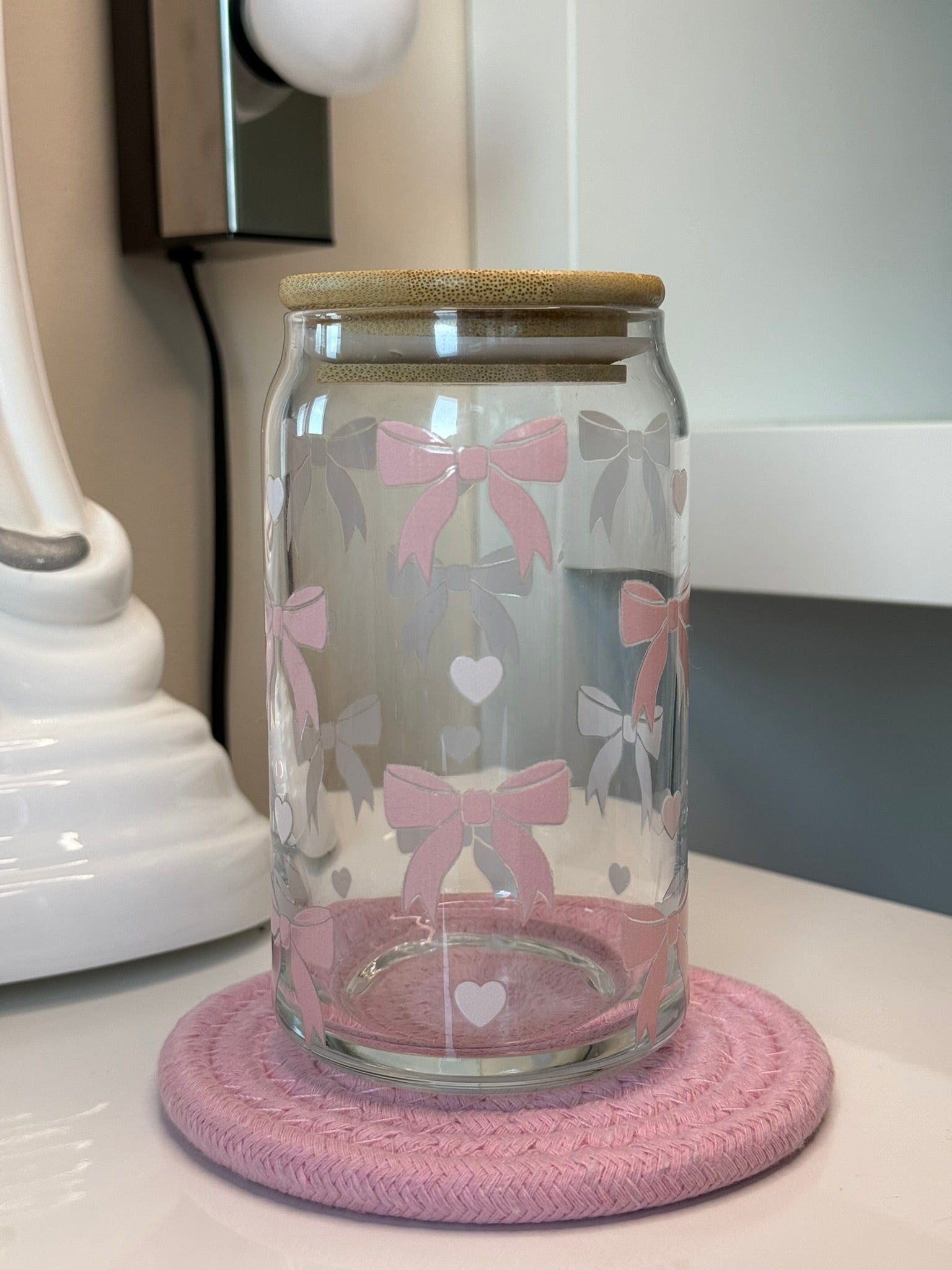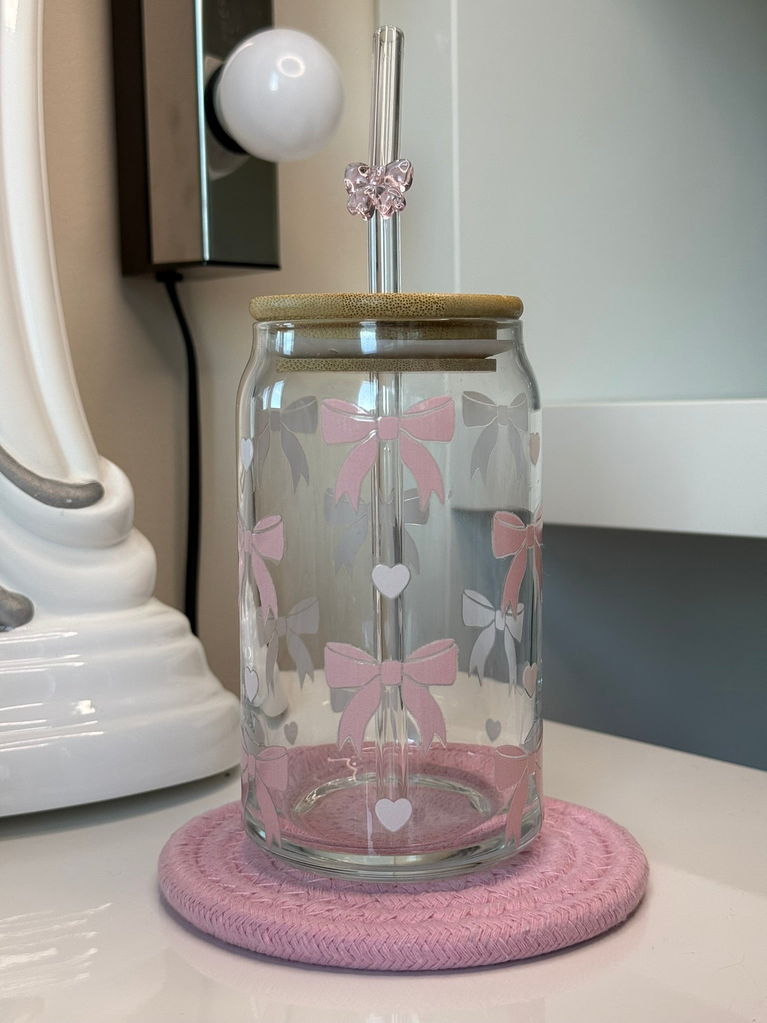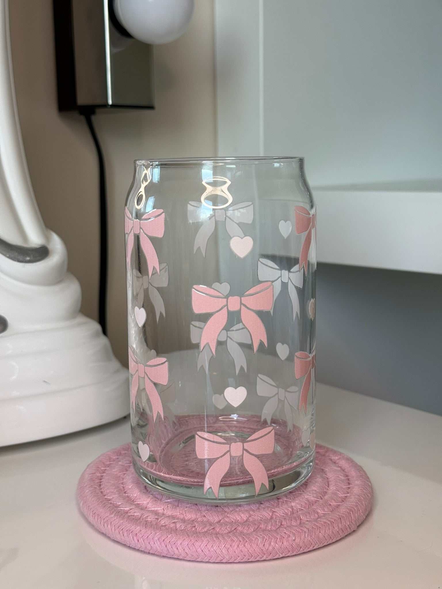 Roztomilost na maximum! Tato sklenička s motivem mašliček a srdíček je jako stvořená pro všechny milovnice jemného stylu, růžových tónů a sladkých detailů. Ideální na limonádu, ledový čaj nebo matcha latté.