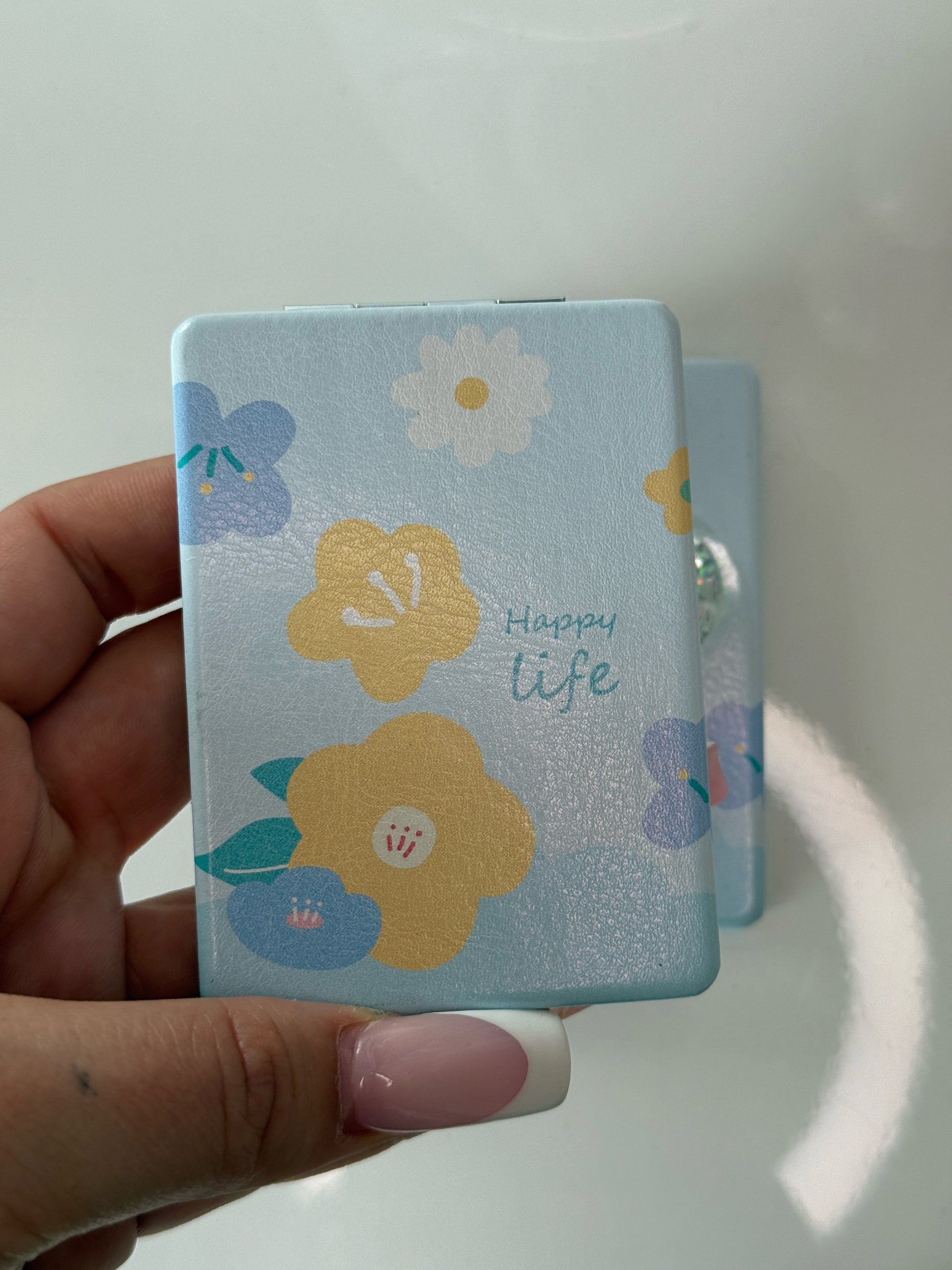 Zrcátko do kabelky s tekutinou a třpytkami modré s bílou květinou